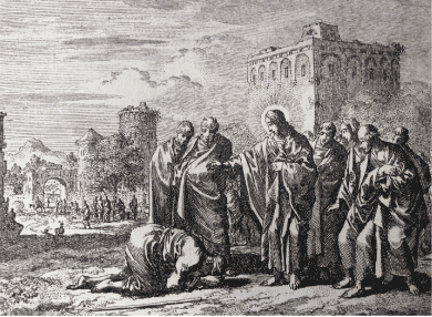 Jesus bemerkt vor sich eine Menschengruppe. Langsam geht er auf sie zu. Er sieht, wie jemand auf einer Trage zu einem Mann in der Mitte gebracht wird. Und der beugt sich zu dem Kranken und spricht mit ihm. Das muss dieser Jesus sein, kommt es ihm in den Sinn. Davon hatte er doch schon einmal gehört. Aufmerksam schaut er hin, wie Jesus den Kranken an seinen Schultern fasst und ihn aufrichtet. Er spürt richtig mit, wie das dem Kranken gut tut. Der hat keine Angst vor der Krankheit, denkt er sich, zu dem muss ich hin! Der muss mir helfen. Der wird mich nicht abweisen. Und er läuft auf die Gruppe zu.