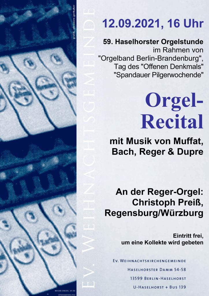 Um 16 Uhr steigt am 12. September die 59. Haselhorster Orgelstunde im Rahmen von „Orgelband Berlin-Brandenburg“, Tag des „Offenen Denkmals“ und natürlich des Pilgerwochenendes. An der Reger-Orgel: Christoph Preiß mit Werken von Muffat, Bach, Reger und Dupre.