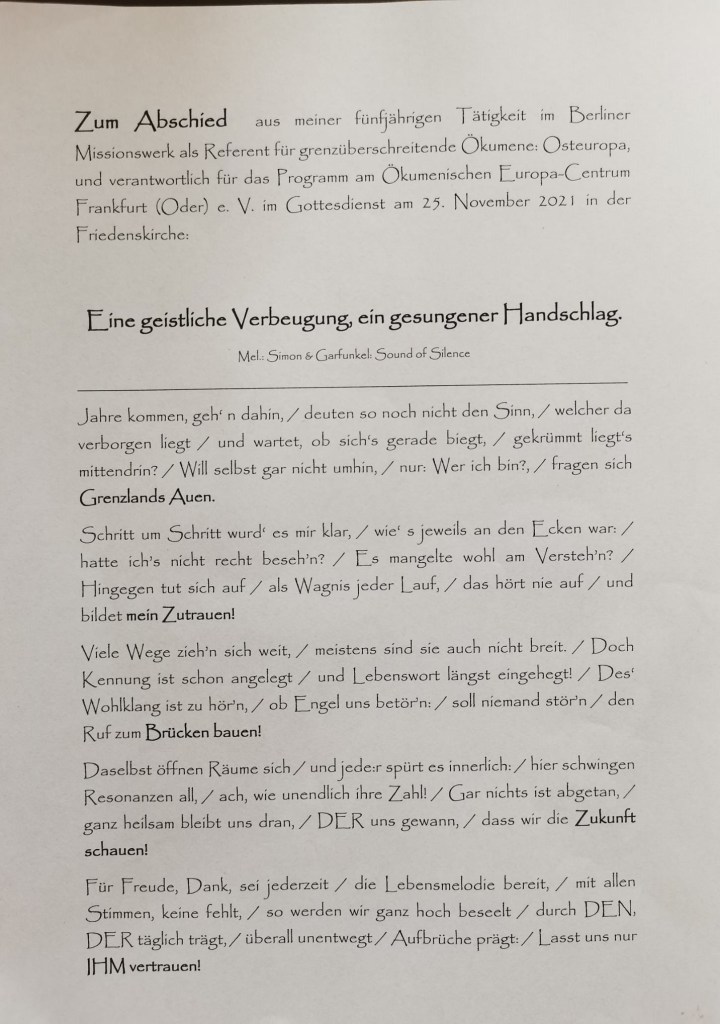 Es war mehr als ein Rückblick. Es war eine Zeitenreise. Die Verabschiedung von Pfarrer Dr. Justus Werdin, Referent für grenzüberschreitende Ökumene und Osteuropa der Evangelischen Kirche Berlin-Brandenburg-schlesische Oberlausitz im Berliner Missionswerk sowie Programmverantwortlicher im Oekumenischen Europa-Centrum Frankfurt (Oder) war voller Impulse.