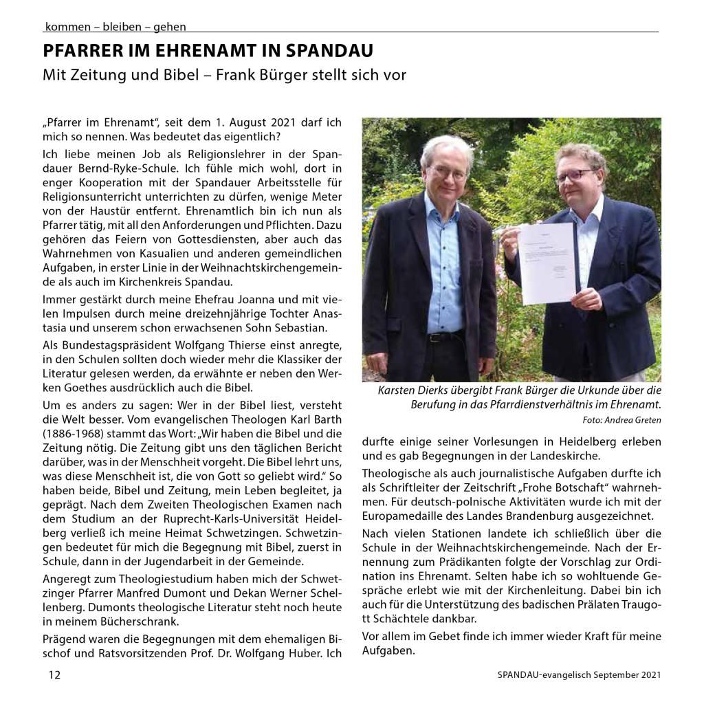 Frank Bürger wurde im August 2021 als Pfarrer im Ehrenamt berufen und ist vorrangig in der Weihnachtskirchengemeinde tätig. Beruflich ist er Religionslehrer in der Spandauer Bernd-Ryke-Schule.