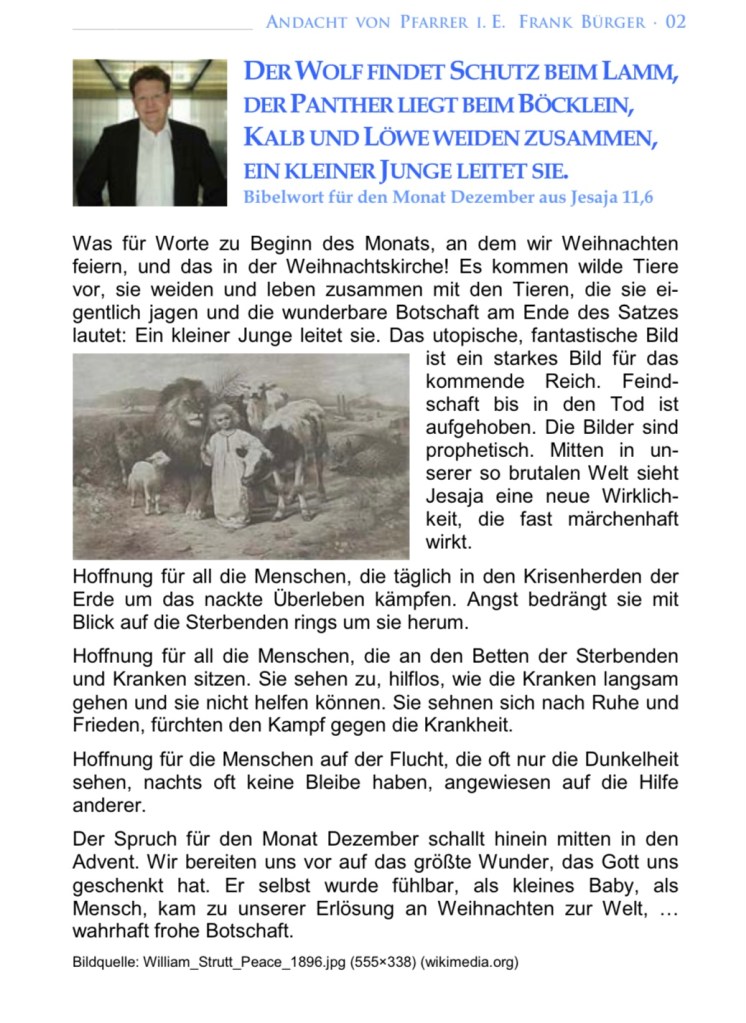 Berlin. Gedanken kommen dieses Mal wieder von Angelika Zädow, Superintendentin in Potsdam, Siegfried Weber, stellvertretender Dekan in Karlsruhe. Es läuten die Glocken der evangelischen Domkirche St. Marien in Fürstenwalde/Spree des brandenburgischen Landkreises „Oder-Spree“ (LOS). Es gibt Tipps aus dem und für den Religionsunterricht, eine Einspielung von Ann-Helena Schlüter. Es gibt Impulse für Kinder von Redaktionsmitarbeiterin Juliane Heger. Es gibt eine Buchempfehlung vom Klotz-Verlag, eine Filmempfehlung kommt von Klassikradio. Jazziges kommt über Andreas Discher vom Jazznet Spandau. Besonders sind die Orgelnoten der Stiftung Orgelklang.