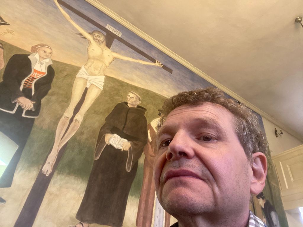 Der Direktor der Kulturstiftung St. Matthäus, Pfr. Neubert beurteilt das gelungene Werk so: „Die Malerei nach den Entwürfen von Gabriele Mucchi und die Glasarbeiten von Helge Warme bringen aufs schönste zum Ausdruck, worum es heute im Kirchenbau gehen muss: authentisches Zeugnis künstlerischer Zeitgenossenschaft auf hohem Niveau ebenso wie ein authentisches Zeugnis geistlichen Lebens.“ Das Wandbild möchte einen Beitrag leisten zur Überwindung von Teilung und ein Zeichen der Hoffnung setzten in Kirche und Welt. Luther und seine Zeitgenossen, Freunde und Gegner versammeln sich auf dem Wandbild unter dem Kreuz und wollen verfremdend in unsere Zeit hinein wirken.