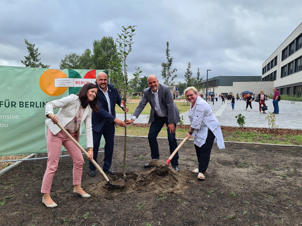 Rosengart beim gemeinsamen Einpflanzen eines Apfelbaums im neu angelegten Schulgarten der 31. Schule (Grundschule) (v. l. n. r.)