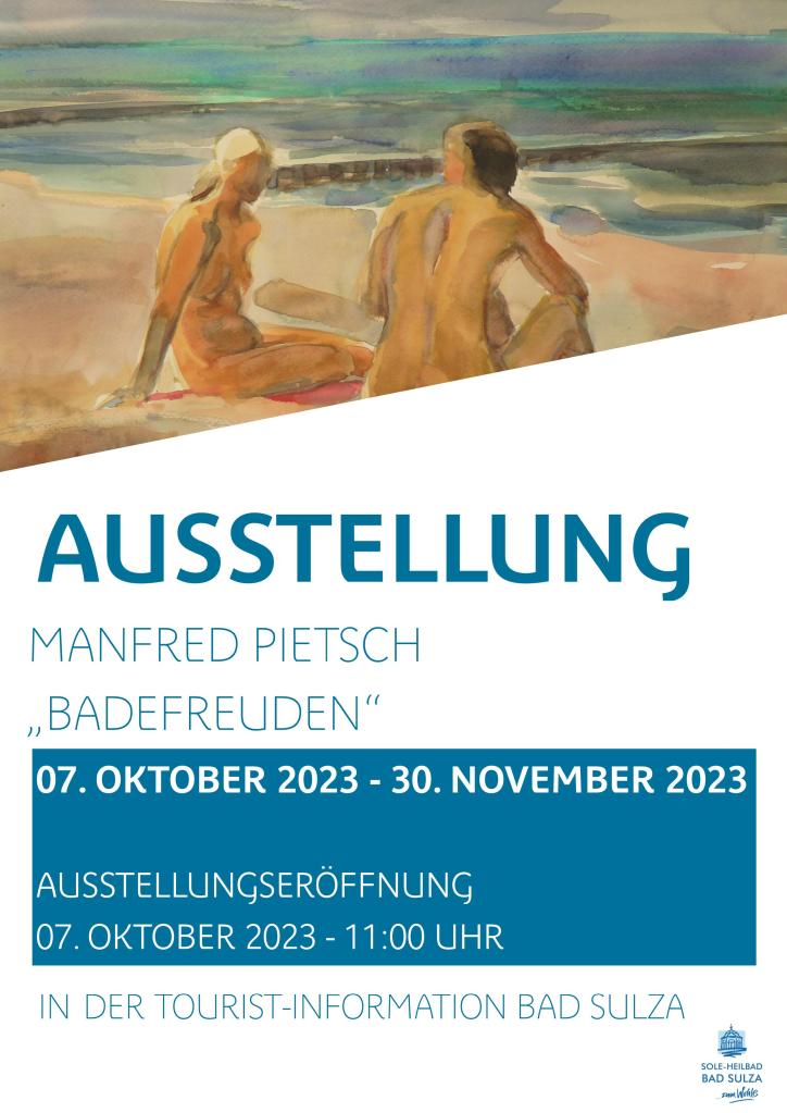 Vom 07. Oktober bis 17. März 2024 zeigt die Tourist Information Bad Sulza Aquarelle und Ölbilder des renommierten Berliner Malers und Grafikers Manfred Pietsch. Zu den wichtigsten Ferien- und Freizeitzielen Deutschlands zählen die Strände von Hiddensee, Rügen und Darß. Das Badeleben am Ufer und das Miteinander in freier Natur sind Gegenstand von Manfred Pietsches Werken.