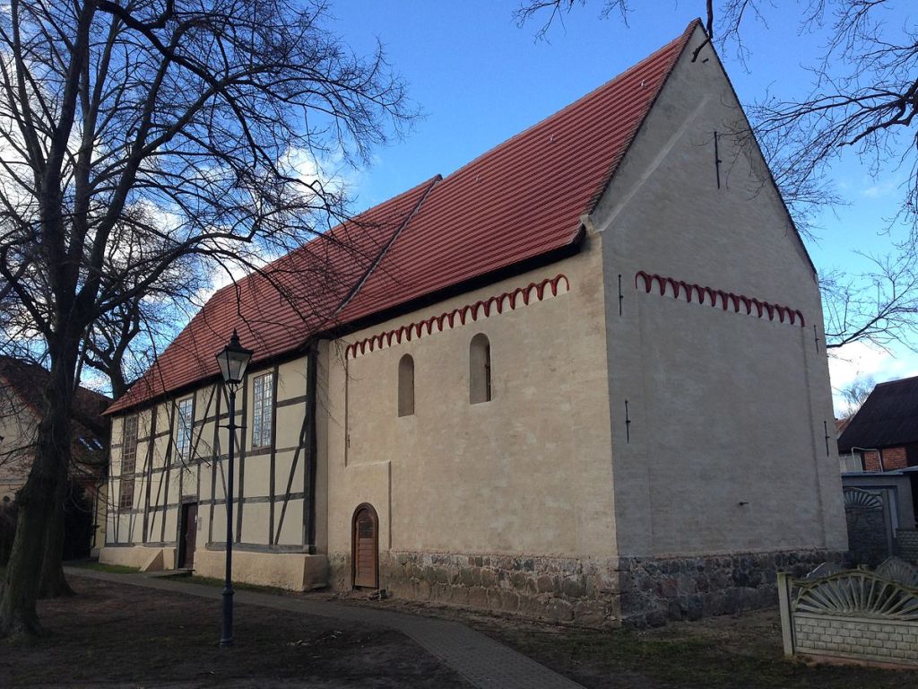 Die einst romanische Backsteinkirche, die unter dem Einfluss des Klosters Jerichow entstand, wurde im 16. Jahrhundert stark zerstört. Heute ist vom Backsteinbau lediglich der rechteckige Chor einschließlich des Triumphbogens erhalten. Nachdem 1658 die Kirche niederbrannte, wurde der Saalbau in Fachwerkbauweise ergänzt und ein separater Glockenturm in gleicher Ausführung, einzigartig im Elbe-Havel-Gebiet, erbaut. Darin befinden sich noch die ursprünglichen Bronzeglocken aus dem 17. Jahrhundert. Im Innenraum sind die mit Engeln bemalte Kassettendecke, der Altar und eine Kanzel mit Bemalungen- die vom Patronat von Treskow gestiftet wurde – zu entdecken. Im Zentrum des Altars ist ein Gemälde mit manieristischen Lichteffekten abgebildet, das auf das Jahr 1658 datiert wurde.
