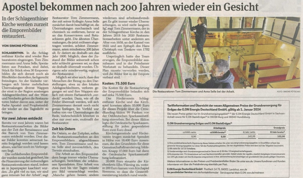 Keine Unbekannte ist Anna-Christin Selle, die mit das Gotteshaus 2019 saniert hat und noch immer saniert. Über den aktuellen Stand informiert Simone Pötschke in der Volkstimme Jerichower Land. Katrin Hertwig hat uns den Beitrag der Volksstimme zur Verfügung gestellt. Herwig, teilt auch mit, dass die Arbeiten bis März abgeschlossen sein sollen. Selle arbeitet für das Restaurierungsatelier Tom Zimmermann.