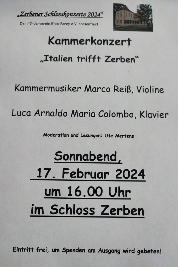 Schon ein Tag später präsentiert Marco Reiß um 16 Uhr im Schloss Zerben ein Kammerkonzert unter dem Titel „Italien trifft Zerben“. Es moderiert Superintendentin Ute Mertens.