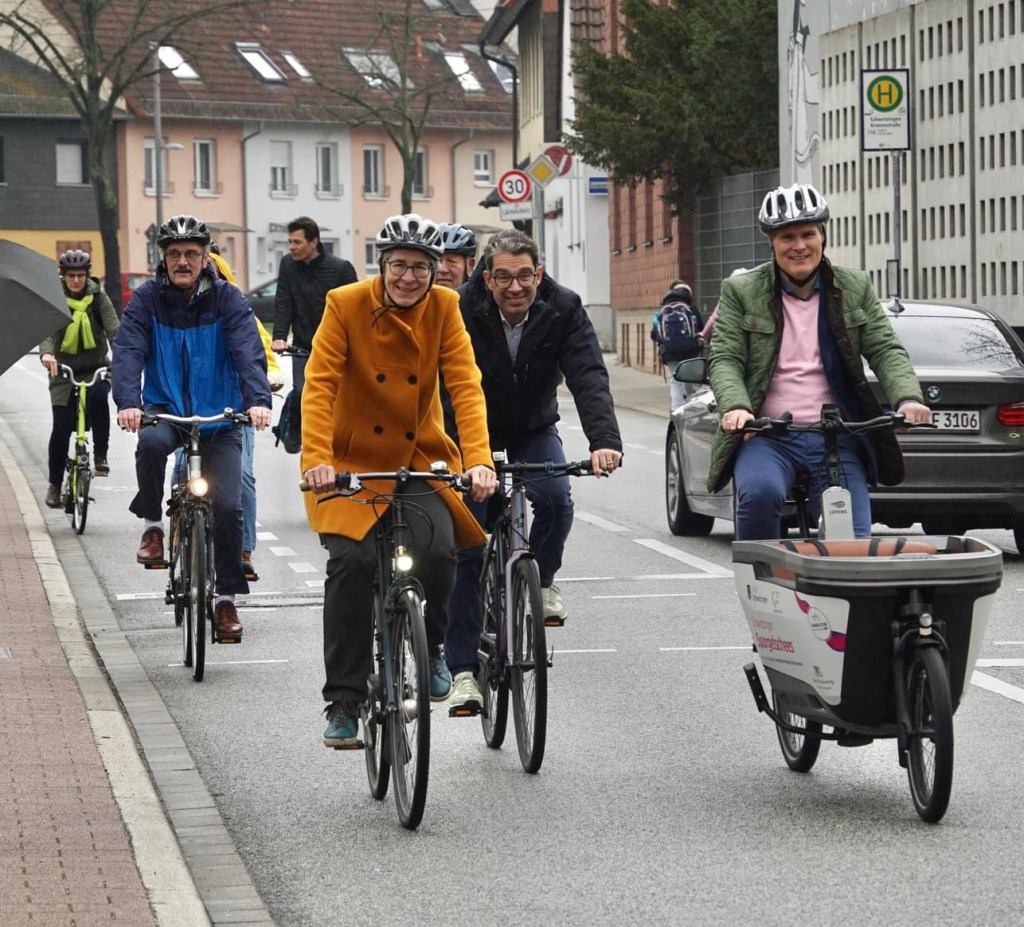 Staatssekretärin Zimmer verdeutlichte beim Termin: „Es ist mir eine besondere Freude, in einer Vorreiterkommune für den Radverkehr zu Besuch zu sein. Es gibt heute gleich zwei Anlässe zu feiern: Die Einweihung des Lastenrades, das ab sofort allen Schwetzingerinnen und Schwetzingern zur Verfügung steht. Jede Bürgerin und jeder Bürger kann sich durch die problemlose Ausleihe davon überzeugen, dass man mit diesem Lastenrad einfach mobil sein kann, dabei klimaschonend unterwegs ist, egal ob für den Transport von Markteinkäufen oder für den Wochenendausflug mit der Familie. Und außerdem startet Schwetzingen jetzt in die große Förderrunde der Initiative RadKULTUR Baden-Württemberg und sorgt damit für noch mehr Schwung für den Radverkehr hier vor Ort.“