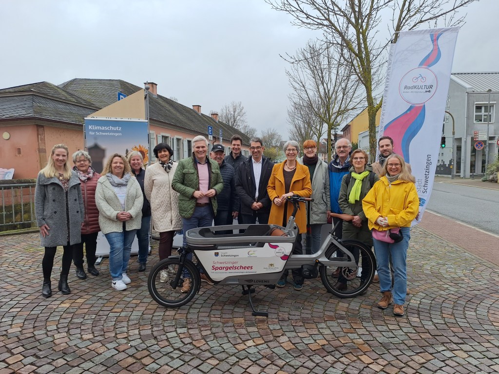 Sie freuen sich über das große RadKULTUR-Förderpaket für Schwetzingen und das Lastenrad „Schwetzinger Spargelschees“: Schwetzingens Bürgermeister Matthias Steffan (6. von links), Staatssekretär Dr. André Baumann (7. von rechts), Staatssekretärin Elke Zimmer (6. von rechts), die Leiterin der Stadtbibliothek Saskia Lindenbeck (links) und ihre Mitarbeiterin Eva Löwe (3. von links), der Leiter des Sachgebiets Klimaschutz und Stadtplanung im Amt für Stadtentwicklung Ramon Eck (2. von rechts) und Mitglieder des Schwetzinger Gemeinderats. Foto: Stadt Schwetzingen