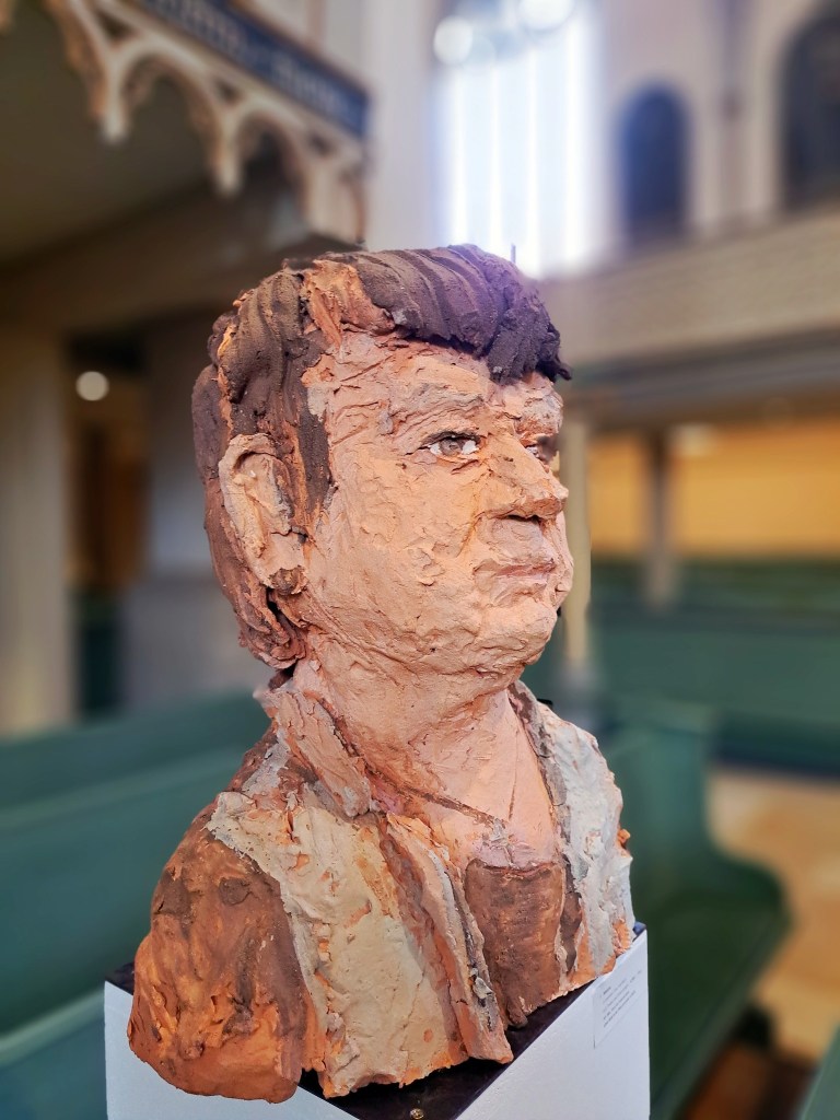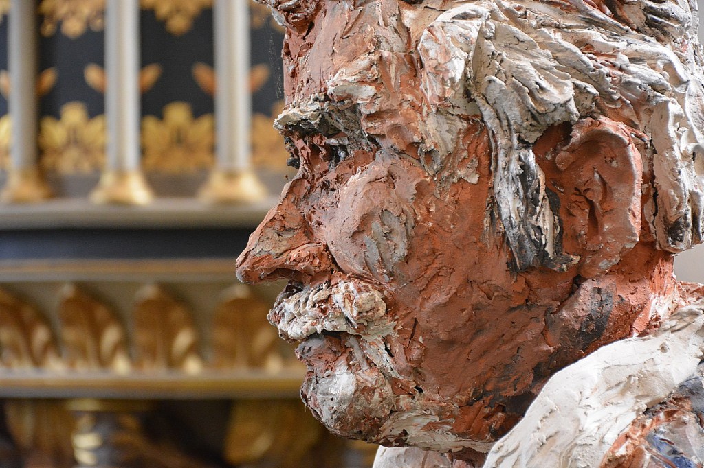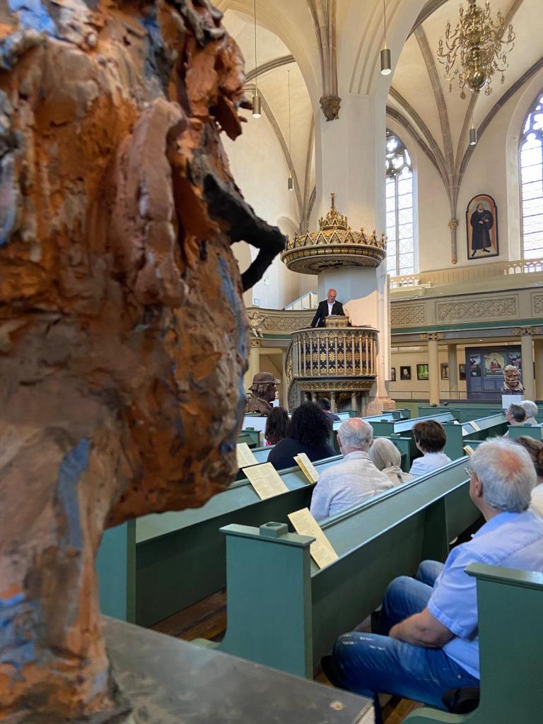 Eingeladen war Harald Birck, um über das Thema Armut zu sprechen. Sie wird oft versteckt und bleibt unbemerkt, wird an den Rand gedrängt und ist mit Scham behaftet. Birck fordert dagegen in seiner Rede: „Armut gehört in die Stadt. Sie darf nicht aus dem Blick geraten.“ Seit vielen Jahren porträtiert der Berliner Künstler Obdachlose und modelliert ihre Köpfe aus Ton. Einige Objekte brachte Birck mit. Sie sind noch bis zum 12. Juni in der Stadtkirche zu sehen. Seine Ausstellung heißt „Auf Augenhöhe“. Dafür sorgt auch ganz wörtlich der Sockel auf dem Birck die Exponate präsentiert.
