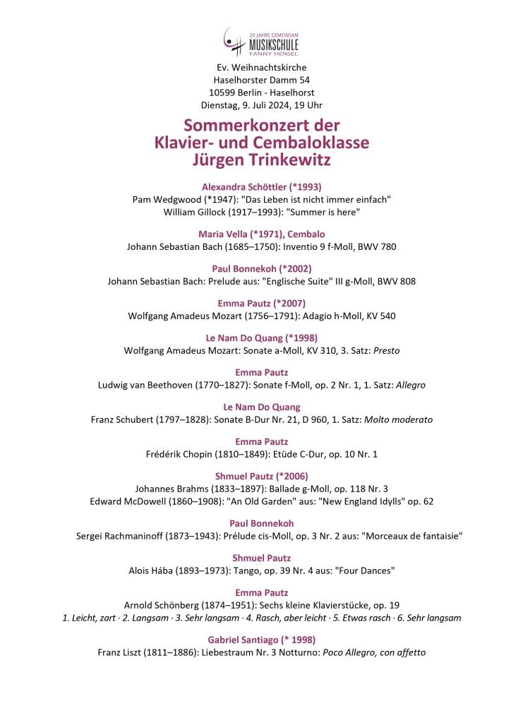 Am Dienstag, den 9.7. findet um 19 Uhr das Sommerkonzert der Klavier- und Cembaloklasse von Kantor Jürgen Trinkewitz statt. „Es ist ein sehr eindrucksvolles Programm, das meine Schüler im letzten Jahr erarbeitet haben“, sagt Trinkewitz