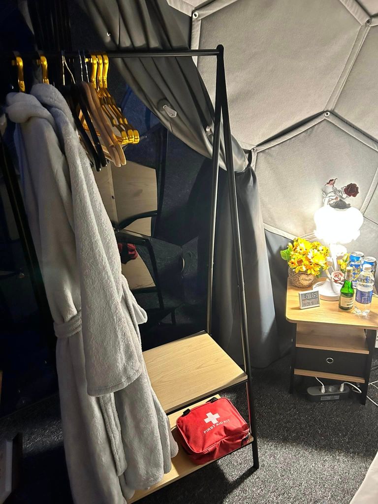 In 60 Metern Entfernung befindet sich ein stationärer Container mit warmem Dusche, Toilette und einer kleinen gemeinsamen Küche. Wir bitten Sie, den Container nach Ihrem Besuch immer abzuschließen, da er für die Gäste unseres Glampings bestimmt ist.