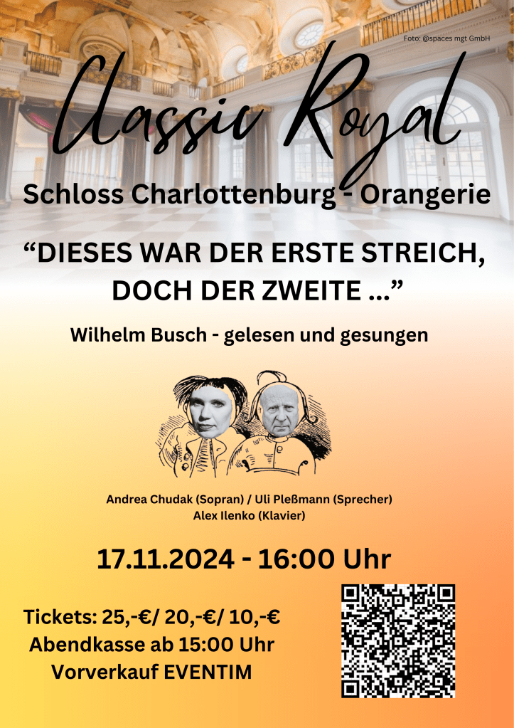 Ich möchte Sie an diesem Wochenende gerne zu einer Gelegenheit einladen, bei der es Wilhelm Busch in Wort und Ton live zu erleben gibt: 17.11.24 um 16:00 Uhr in der Großen Orangerie des Schlosses Charlottenburg. Dort widmen sich der Schauspieler Uli Pleßmann, die Sängerin Andrea Chudak und der Pianist Alex Ilenko unter dem Titel „Dieses war der erste Streich, doch der zweite…“ sowohl seinen Gedichten und Beobachtungen wie auch der Geschichte von „Max & Moritz“ mit ihren sieben berühmten Streichen. Ein Programm für jedes Alter…