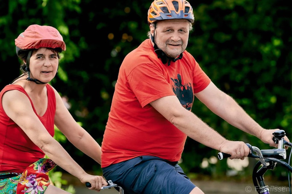 »Seit fast 22 Jahren leben wir als Familie in Karlsruhe, und wir genießen es, ohne eigenes Auto auszukommen. Fast alle Wege in der Stadt legen wir mit dem Fahrrad zurück, in unserer Garage befinden sich neben dem Tandem auch ein Lastenanhänger, Mountainbikes, ein E-Bike und pro Familienmitglied mindestens ein funktionstüchtiges Fahrrad. Wir sind also flexibel! Die Infrastruktur für Fahrradfahrer*innen hat sich deutlich verbessert in unserer Stadt – wir sehen aber noch viel Luft nach oben.« Monika Roth und Wolfgang Neber-Roth