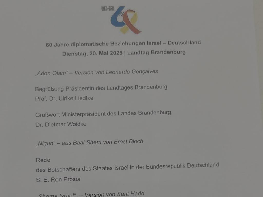 Festakt zu 60 Jahre diplomatische Beziehungen Israel – Deutschland im Landtag zu Potsdam. Sehr würdevoll mit Begrüßung durch Präsidentin Ulrike Liedtke, Grußwort von MP Dietmar Woidke, Rede von Botschafter Ron Prosor und Podiumsdiskussion mit Ron Prosor, Ulrike Liedke und Länderbeauftragtem Andreas Büttner. Wichtige Auseinandersetzung, Innehalten und gemeinsames Nachdenken über die gemeinsame Vergangenheit, Gegenwart und Zukunft.