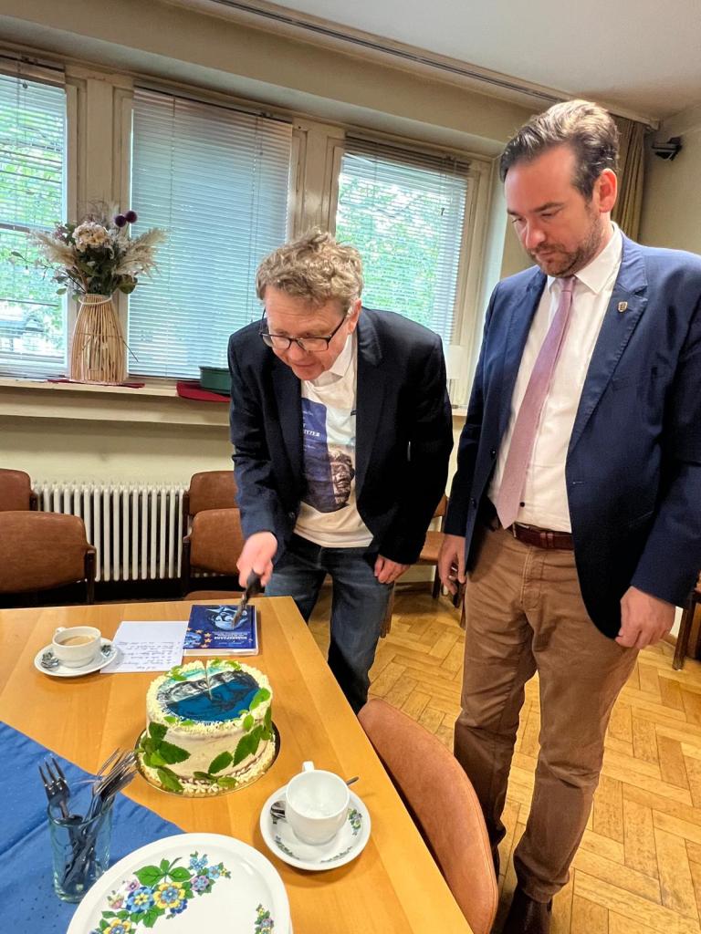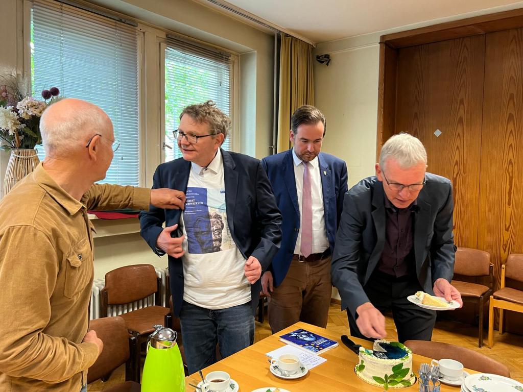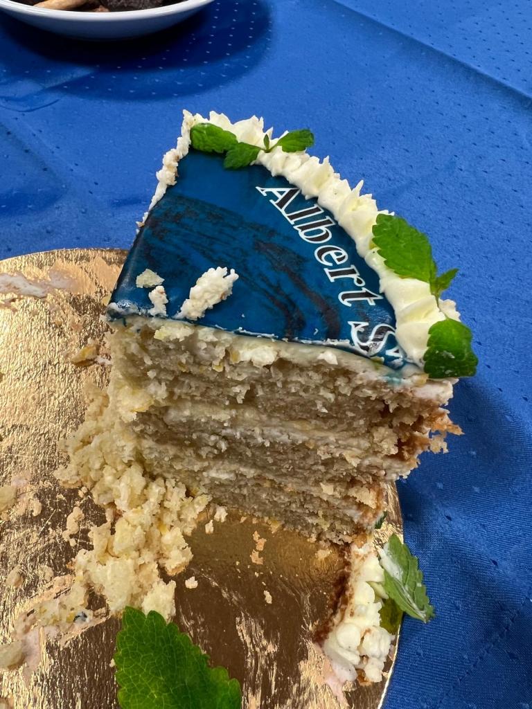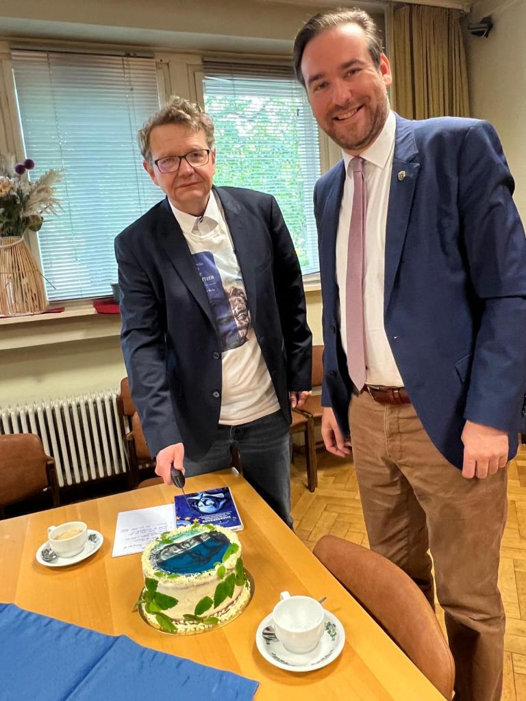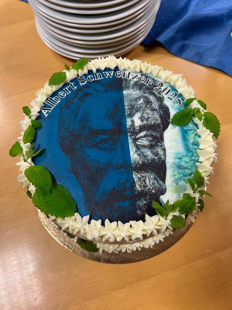 Als besondere Überraschung gab es dazu eine „Schweitzer-Torte“, geschmückt mit dem Cover zum Albert-Schweitzer-Buch, das im Oktober erscheinen wird und in Berlin und Schwetzingen präsentiert wird.