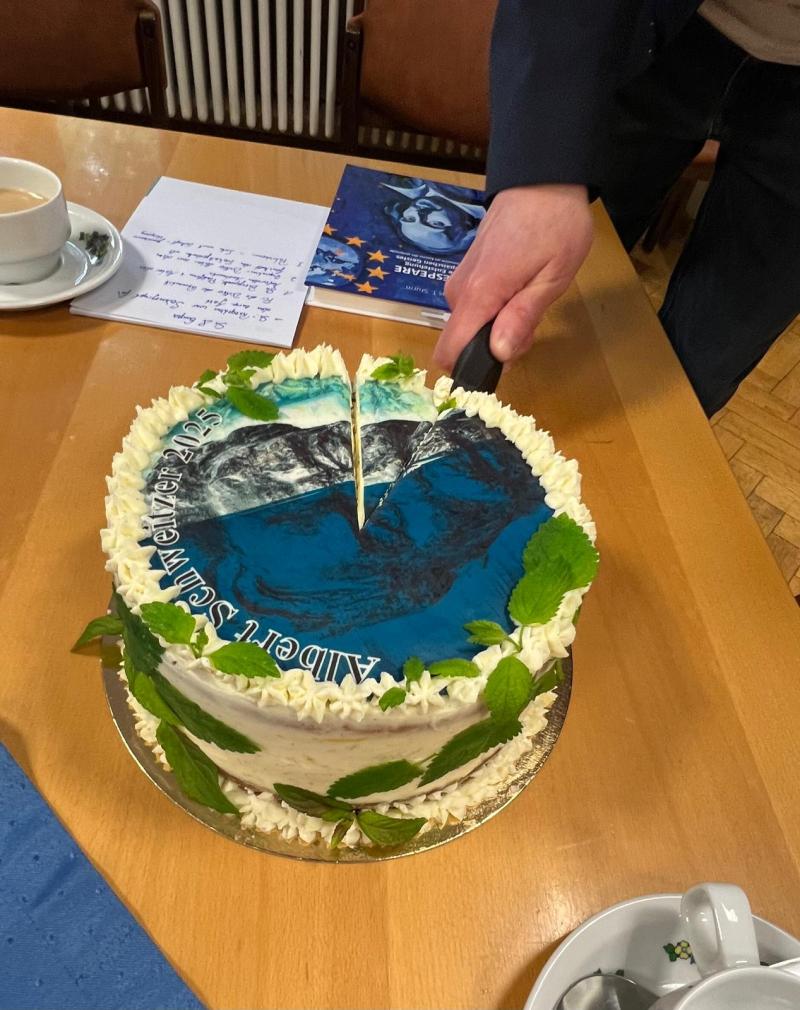 Die Torte von Lealeckerleberlin weist hin auf das neue Buch zum Albert Schweitzer. In Schwetzingen gibt es ein Treffen mit Herausgeber Wolfgang Schröck-Schmidt.
