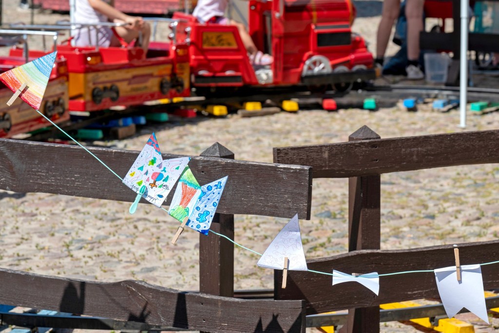 Das anschließende „Blumengebet“, begleitet von den Bläsern ist eines von vielen tollen Ideen, die den Gottesdienst auf dem weiten Platz zu einem Gemeinschaftserlebnis werden lassen. Eine andere, das Interview vom Pastor Frank mit Bürgermeister Christian Hartphiel. Und die bunte Wimpelkette, von den Kindern während des Gottesdienstes gestaltet, die anschließend von Stuhl zu Bank und Mensch zu Mensch über den Markplatz zieht. Kirche unterwegs und mittendrin.