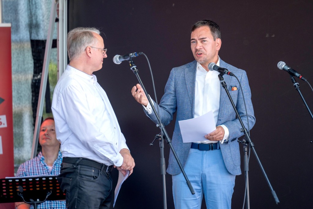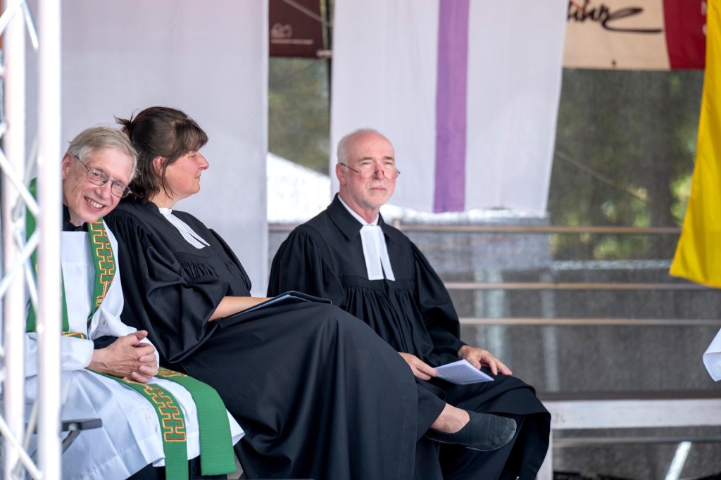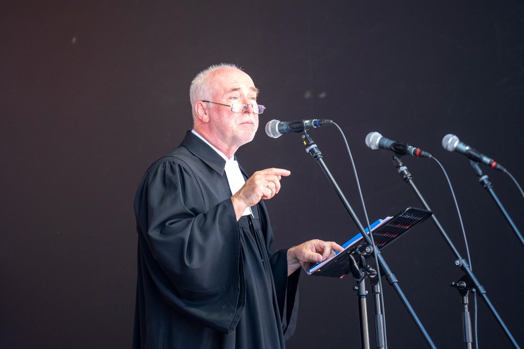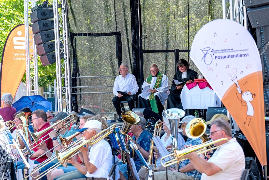 Den geistlichen Gottesdienstteil gestalteten Pfarrer Thomas Höhle von der katholischen Gemeinde, Pastor Manfred Frank von der Evangelisch Freikirchlichen Gemeinde, die Templiner Pfarrerin Annegret Kaufmann sowie Superintendent Hans-Georg Furian vom Kirchenkreis Berlin Süd-Ost. Er ist zugleich einer der vier Stellvertreter des Landesposaunenpfarrers und hielt als solcher die Predigt „zum und mit frischem Wind“. Er hatte auch seine Trompete dabei. Doch das Intro zur Predigt kam vom Handy: „Wind of Change“ von den Scorpions.