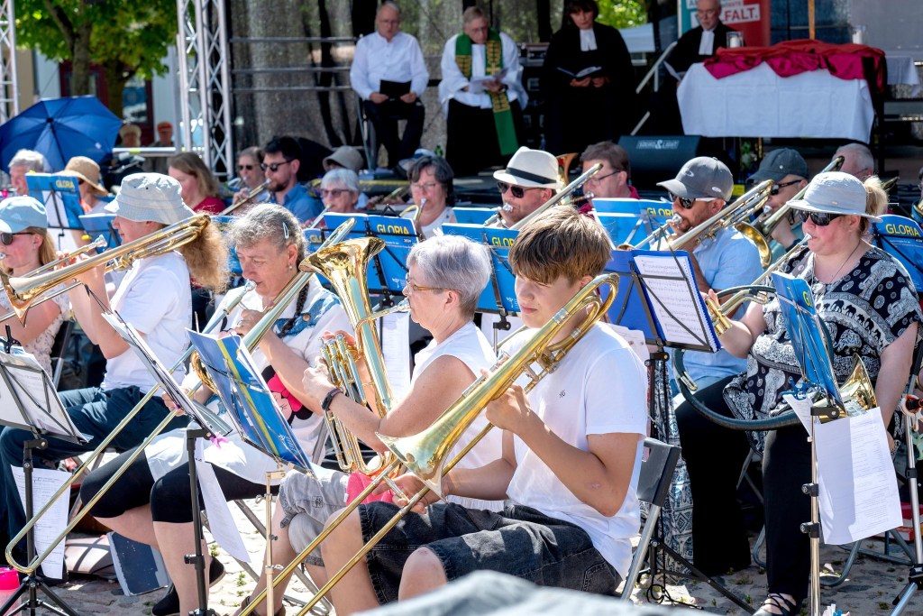 Rund 50 Bläserinnen und Bläser aus dem gesamten Kirchenkreis waren angereist. Die weitesten aus Velten, Kremmen, Oberkrämer. Natürlich sind die Templiner auch dabei. Unter Leitung von Landesposaunenwart Christian Syperek gestalten sie den musikalischen Gottesdienst mit anschließendem Platzkonzert trotz aufkommender Mittagshitze.