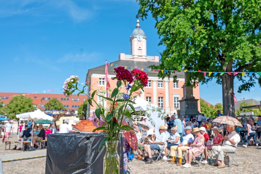 Denn die Sonne meinte es fast zu gut mit dem Gottesdienst zum Stadtmauerfest auf dem Marktplatz vorm Alten Rathaus. Die schattigen Plätze unterm Blätterdach sind schnell besetzt. Überall saßen Menschen in Gruppen zusammen, um der Musik und dem Gottesdienst zu folgen. Wohl dem und der, die Regen- oder Sonnenschirme aufspannen konnten.