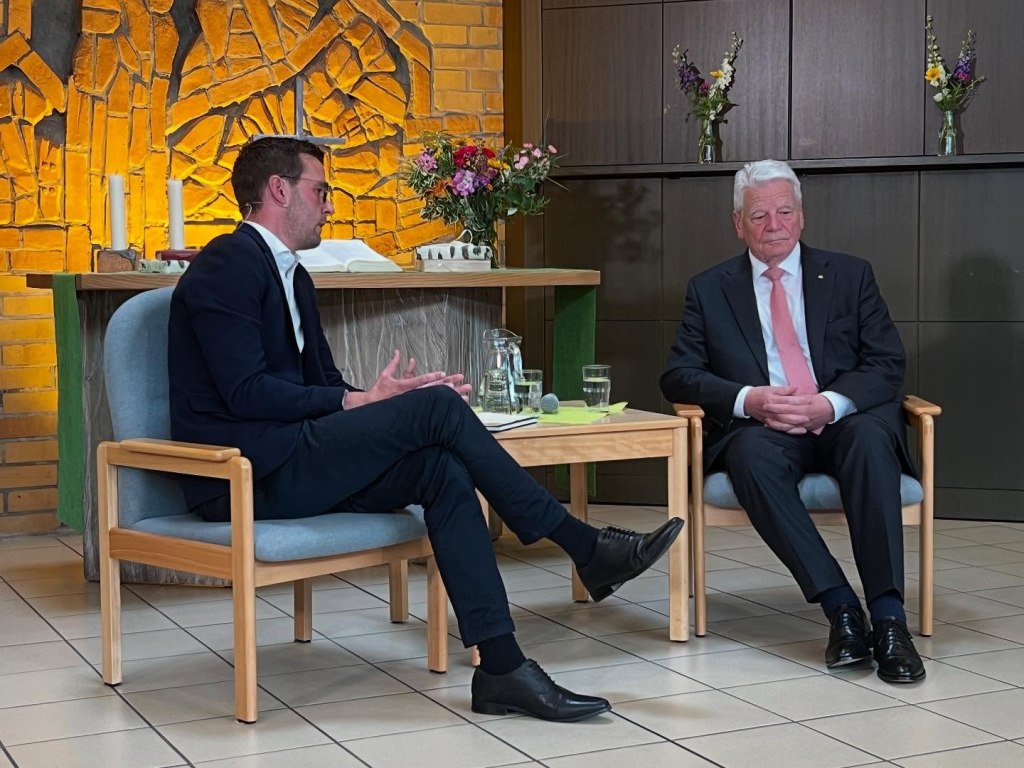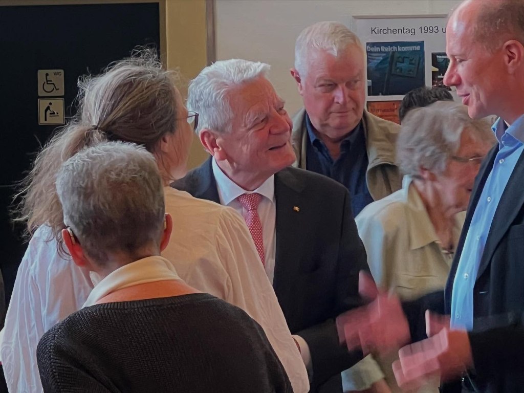 50 Jahre Stern-Kirchengemeinde in Potsdam mit hohem Besuch. Bundespräsident a.D. Joachim Gauck hielt einen Festvortrag zur Rolle der Kirchen in der DDR und heute und nahm die Zuhörenden mit seiner bildhaften und prägnanten Art mit, sprach von der Freiheit nicht nur von, sondern auch wofür, von Freiheit als Verantwortung, von trotz-mutig-widerständiger Hoffnung. Er illustrierte das sehr eindrücklich an seiner eigenen Biographie und wurde im Gespräch mit den Anwesenden vom Moderator Jan Kingreen zu mancher Antwort herausgelockt. Schöne Musik des Gitarrenduos Valentin Dieterich und Shterion Urumov aus Berlin gab den Rahmen, Pfarrer Martin Rothe und GKR-Vorsitzender Andreas Bahr leiteten den Abend und Generalsuperintendent Kristóf Bálint hielt ein Grußwort.