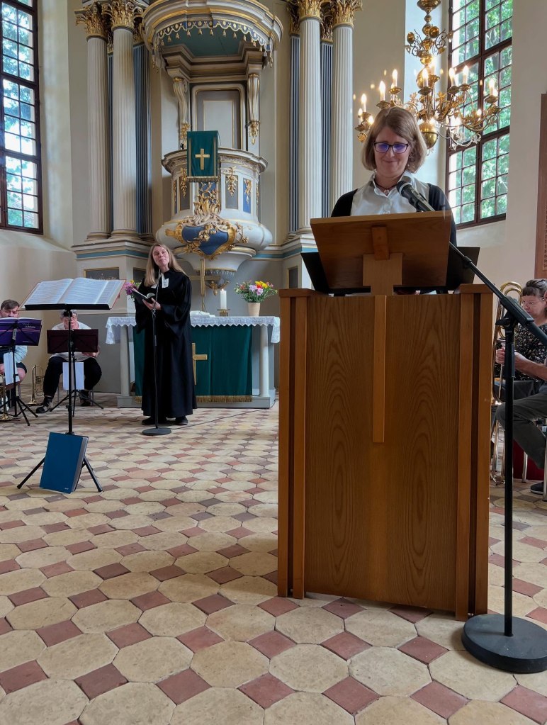 In einem musikalischen Gottesdienst wurde heute Birgitte Koppehl als stellvertretende Leitung der Kollegialen Leitung des Kirchenkreises Barnim von Generalsuperintendent Kristóf Bálint eingeführt und das gesamte Leitungsteam neu unter den Segen G’TTes gestellt. Die Kollegiale Leitung besteht nunmehr aus Dorothea Hartmann, Christiane Werner, Birgitte Koppehl und dem Vorsitzenden Christoph Brust. Im Anschluss an den schönen musikalischen Gottesdienst, begleitet von den Posaunenchören von Lobetal und Biesenthal, trafen sich alle im Pfarrgarten zu guten Gesprächen und leckeren Mocktails.