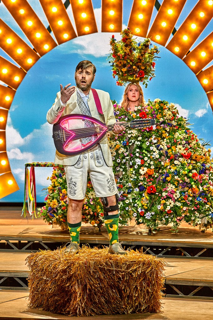 Wie sah Davids Ansatz auf der Bühne aus? Am Beispiel der Festwiese: So wie Nürnberg sucht den Superstar – der Johannistag, das Hochfest der Geburt Johannes’ des Täufers, auf Humor getrimmt als schnödes Volksfest. Außerdem rosa Fachwerk und rosa Leder. Dieses Konzept beschreibt die gesamte Inszenierung recht gut.