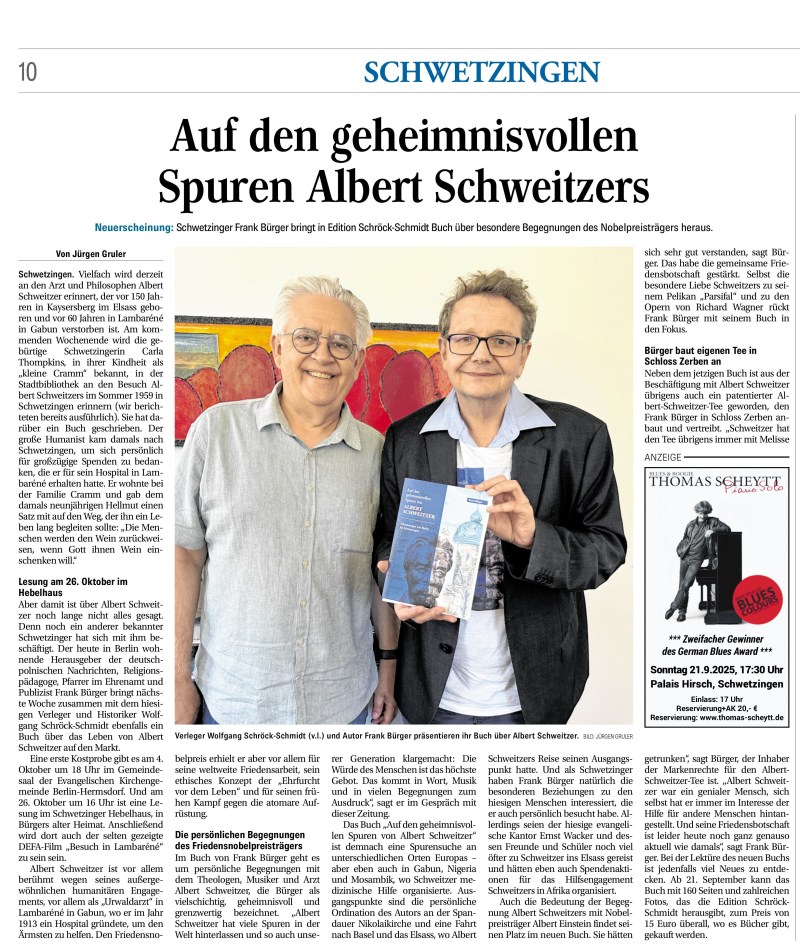 - Frank Bürger – Buchautor, der aus seinem Werk über Albert Schweitzer Einblicke und Gedanken teilen wird und damit den Abend literarisch bereichert.