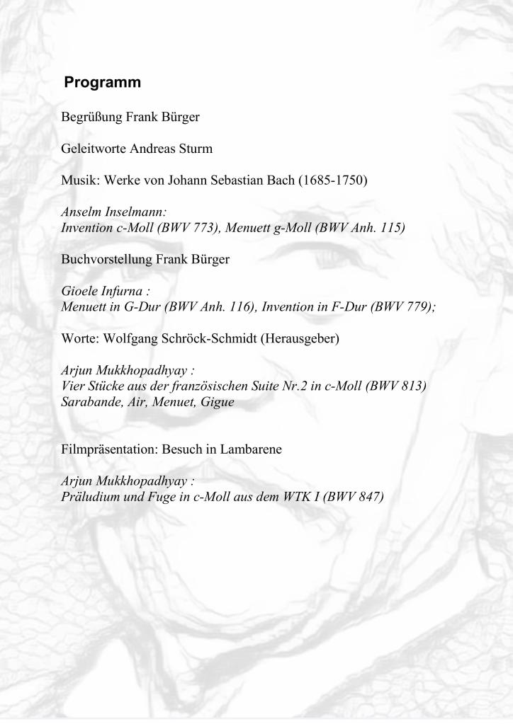 Die jungen Pianisten umrahmen die Lesung mit Werken von Johann Sebastian Bach, dessen Musik Albert Schweitzer zeitlebens besonders verehrte – ein Thema, das auch in Frank Bürgers Buch eine wichtige Rolle spielt.