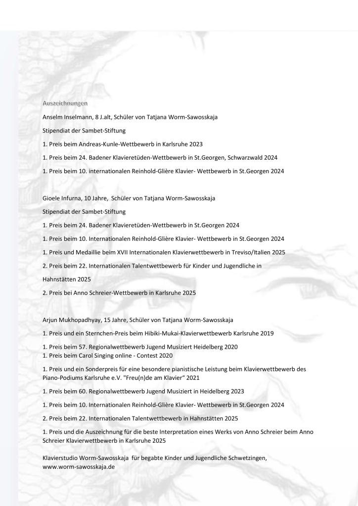 Die Veranstaltung erhält eine besondere musikalische Note: Die musikalische Umrahmung der Buchpräsentation übernehmen drei junge Ausnahme-Talente, internationale Preisträger und Schüler von Schwetzinger Konzertpianistin Tatjana Worm-Sawosskaja: der 8. jährige Anselm Inselmann, der 10.jährige Gioele Infurna und der 15.jährige Arjun Mukhopadyay.