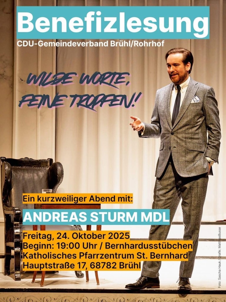 „Die CDU Brühl-Rohrhof lädt am Freitag, 24. Oktober, um 19:00 Uhr zu einer Benefizlesung mit dem CDU-Landtagsabgeordneten und Autor Andreas Sturm in das Bernhardusstübchen (Katholische Pfarrzentrum Brühl) ein.