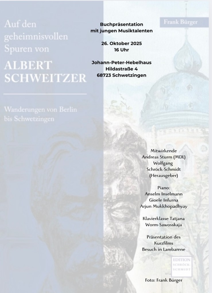 Der Verlag Edition Schröck-Schmidt und Autor Frank Bürger haben in einer Pressemitteilung zu einer Buchvorstellung eingeladen: Am Sonntag, 26. Oktober, um 16 Uhr wird im Johann-Peter-Hebelhaus, Hildastraße 4 in Schwetzingen, Bürgers neues Werk „Auf den geheimnisvollen Spuren von Albert Schweitzer“ vorgestellt.