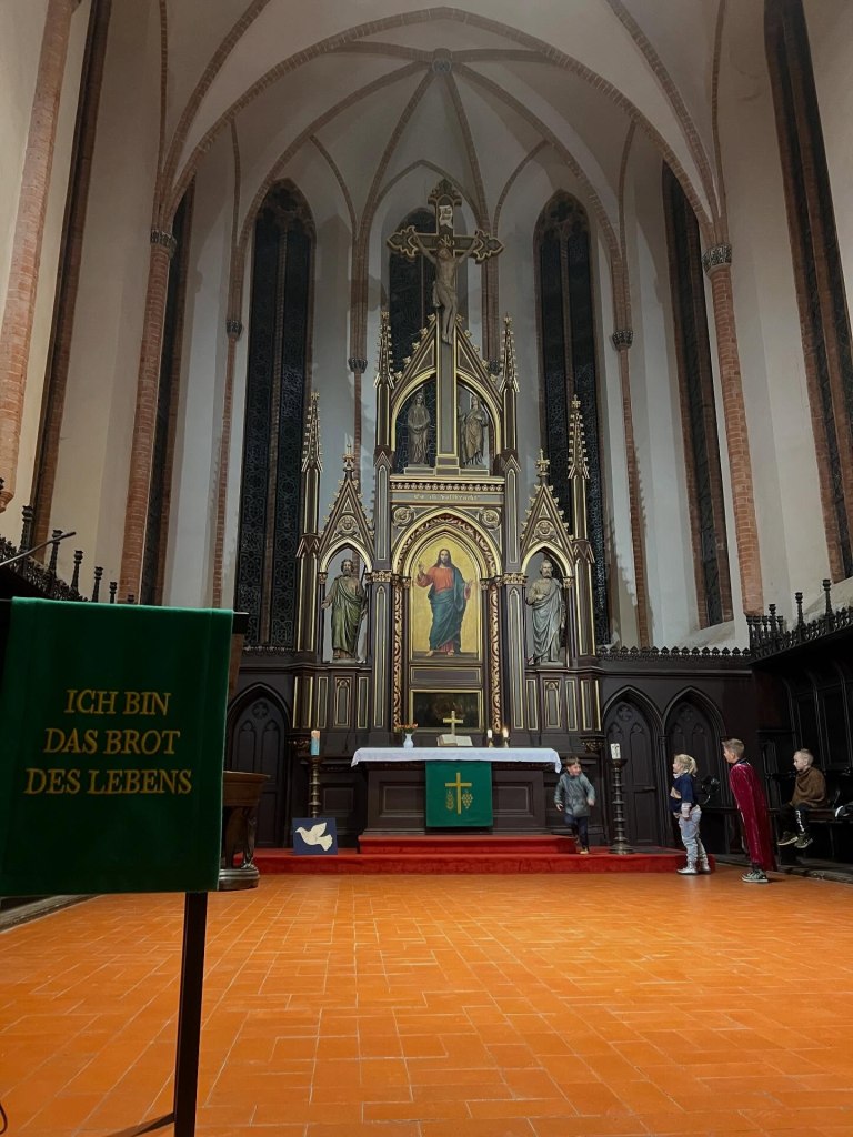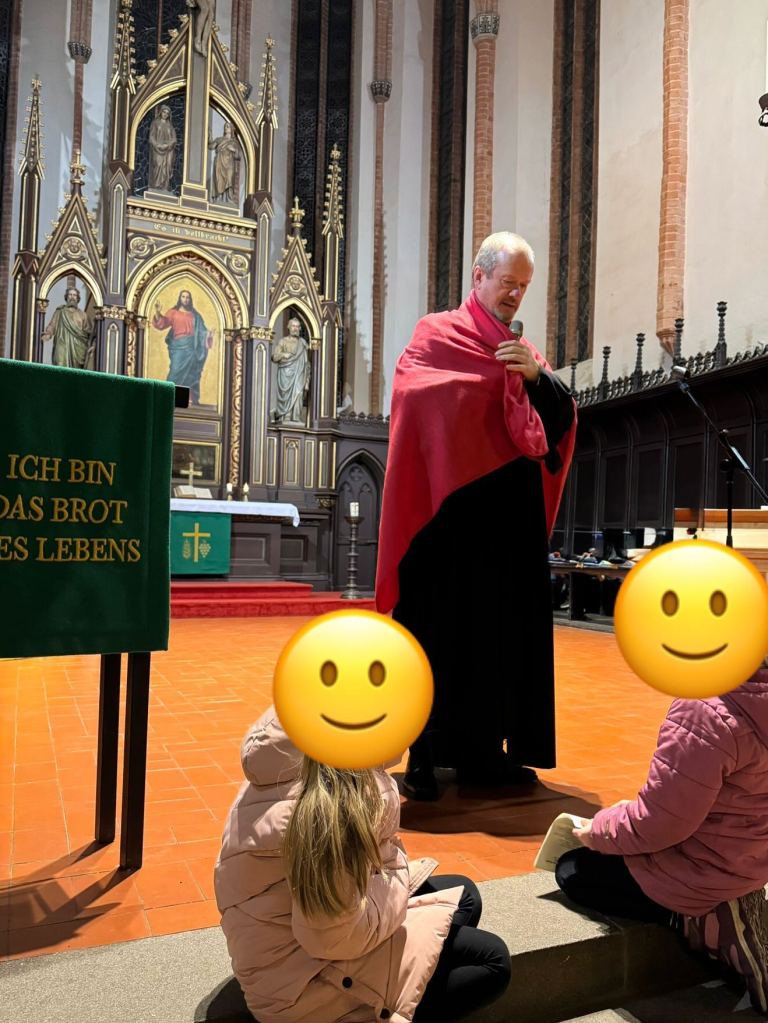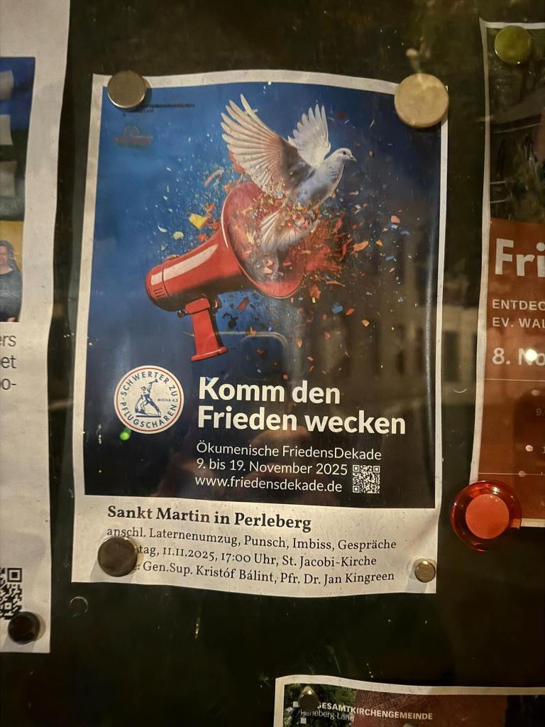 Martinstag im Rahmen der Friedensdekade mit dem Friedensbeauftragten der EKBO, Dr. Jan Kingreen, mit den Perlenkindern und ihren Eltern, mit pastora loci, Verena Mittermaier, und wunderbaren Kindern, die Martin, seinen Vater und den Bettler sehr überzeugend darstellten. Ein schöner Laternenumzug zum Abschluss, mit geteilten Martinshörnchen und Verpflegung am Ende der Strecke durch die Stadt. Geteilte Zeit unter dem Motto „Frieden ist wie ein warmer Mantel.“