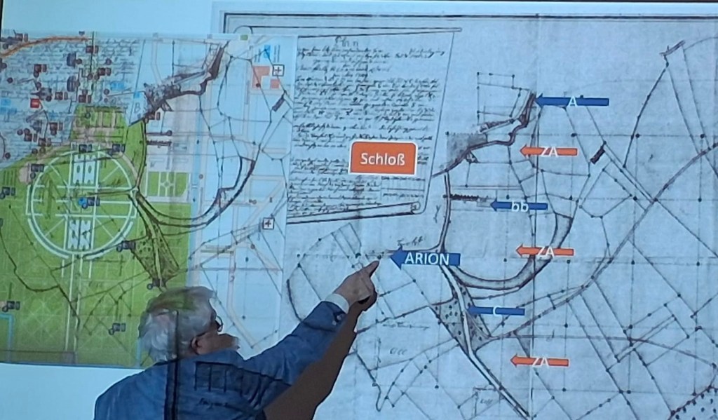 Im zweiten Vortrag widmete sich Wolfgang Schröck-Schmidt der kartographischen Arbeit von Christian Mayer, insbesondere seiner großen Kurpfalzkarte. Der Referent stellte die frühen Vermessungsarbeiten Mayers vor und rückte dabei die große Kurpfalzkarte sowie die sogenannte Kurpfalzachse – bestehend aus Königsstuhl, Schwetzingen und Kalmit – in den Mittelpunkt. Diese Achse verläuft direkt durch den Schwetzinger Schlossgarten, den Schlossplatz sowie die Carl Theodor-Straße. Ein besonderes Highlight für die Besucher war die Möglichkeit, die große Kurpfalzkarte an der Wand des Vortragssaals zu betrachten und sich somit intensiv mit der allerersten Karte der Kurpfalz auseinanderzusetzen.