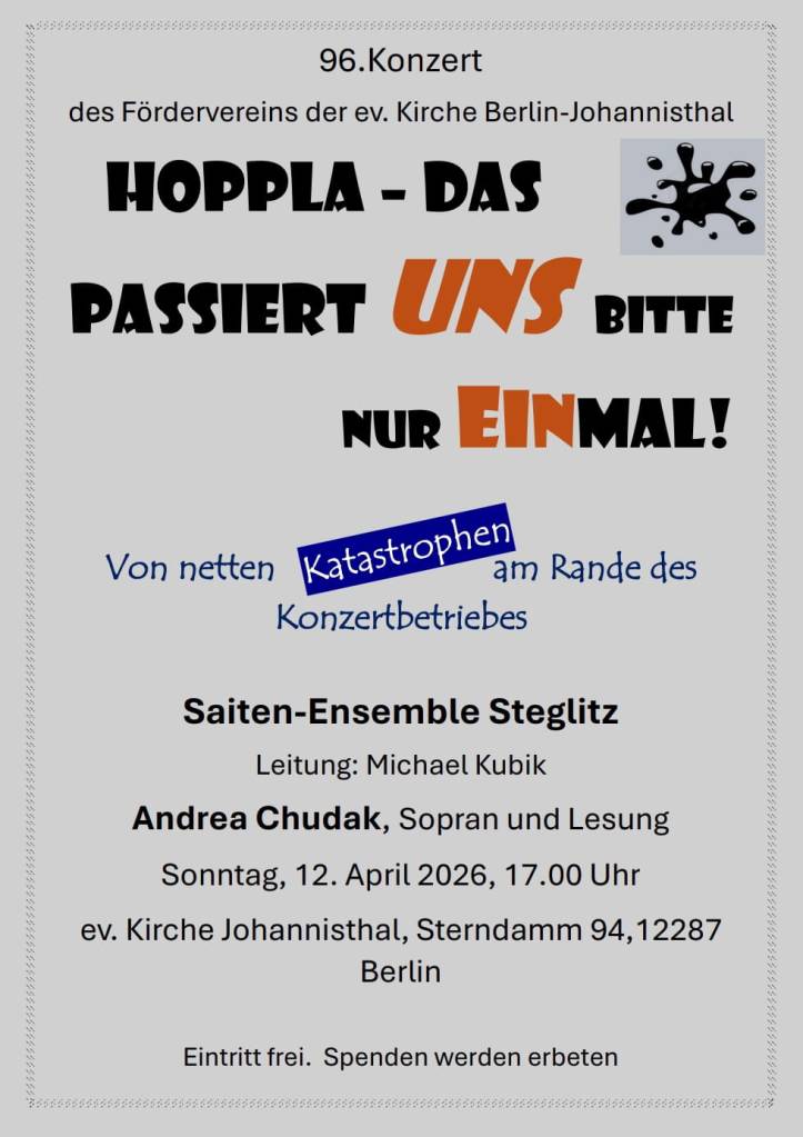 Gelesen werden Anekdoten aus meinem sehr heiteren Buch „Keine Sorge, wir machen das zum ersten Mal“ (erschienen im TeGe-Verlag) sowie lustige Begebenheiten des Saitenensembles Steglitz. Unter Leitung von Michael Kubik erklingen durch uns Arien, Lieder und Instrumentalmusik vom Barock bis hin zum Musical.