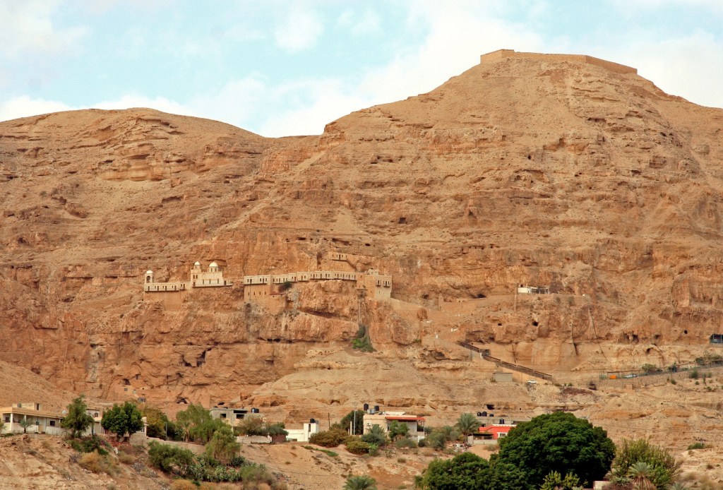 Das Kloster oberhalb von Jericho (drei Kilometer nordwestlich) in der judäischen Wüste und 350 Meter über dem Meeresspiegel klebt wie ein Wespennest am Fels, es wurde unmittelbar über der senkrechten Wand des Berges errichtet und stülpt sich über der Höhle, in welcher der Überlieferung nach Jesus seine Fasten- und Gebetszeit verbracht haben soll. Die Grotte wurde zur Kapelle ausgestaltet und erhielt den Namen „Kapelle der ersten Versuchung“. Der Altar steht über dem Stein, auf dem Jesus der Überlieferung nach gesessen haben soll.